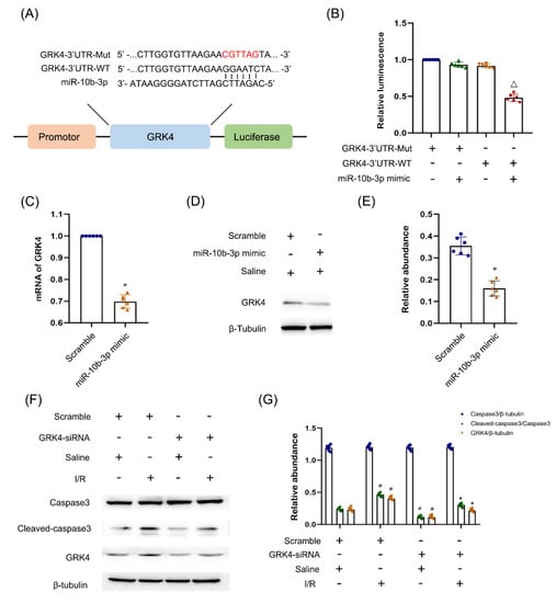 GRK4 was a direct target gene of miRNA−10b−3p. BUMPT cells were transfected with 100 nM miRNA−10b−3pmimics plus with or without GRK4−WT or Mut plasmid for 24 h. BUMPT cells were transfected with GRK4 siRNA, and then treated with I(2 h)/R(2 h) injury. (A) Representative miR−10b−3p complementary binding sites or mutated sequence in the 3′UTR of GRK4 mRNA. (B) Representative the luciferase activities. (C) RT−qPCR analysis of the expression of GRK4. (D) Immunoblot analysis of GRK4 andβ−tubulin. (E) The gray analysis between them. (F) Immunoblot analysis of Cleaved−caspase3, Caspase3, GRK4, and β-tubulin. (G) The gray analysis between them. Data are expressed as mean ± SD (n = 6). Δp < 0.05 vs. co-transfection of miR−10b−3p mimic and GRK4-3′UTR-WT or GRK4-3′UTR-MUT groups, # p < 0.05 vs. saline with scramble group; * p < 0.05 vs. I/R with scramble group.