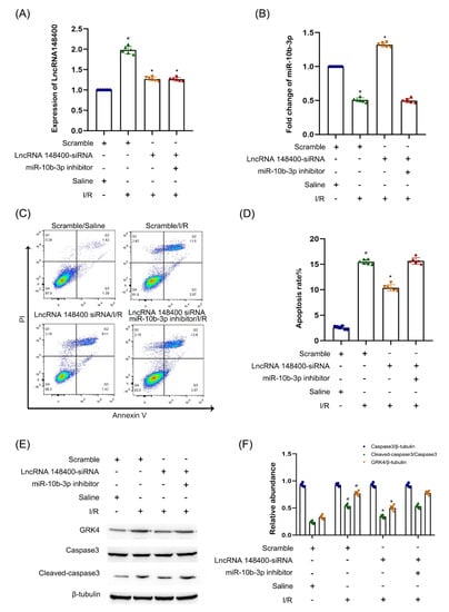 Knock down of LncRNA148300 attenuated the I/R induced BUMPT cell apoptosis was reversed by anti−miR−10b−3p. BUMPT cells were co-transfected with100 nM lncRNA148400 siRNA plus with or without anti−miR−10b−3p, and then treated with I(2 h)/R(2 h) injury. (A) RT−qPCR analysis the expression of LncRNA148400. (B) RT−qPCR analysis of the expression of miR−10b−3p. (C) FCM analysis of apoptosis in BUMPT cells. (D) Representative apoptosis rate (%). (E) Immunoblot analysis of the expression of Caspase 3, cleaved-caspase3, GRK4, and β−tubulin. (F) The gray analysis between them. Densitometric measurement of protein signals. Data are expressed as mean ± SD (n = 6). # p < 0.05 vs. saline with scramble group; * p < 0.05 vs. I/R with LncRNA148400 siRNA group.