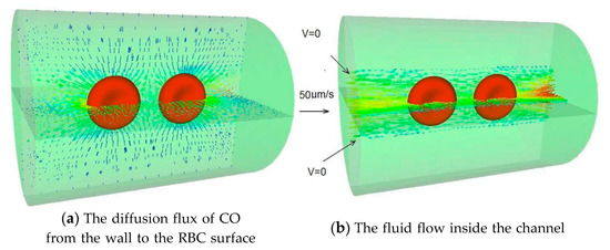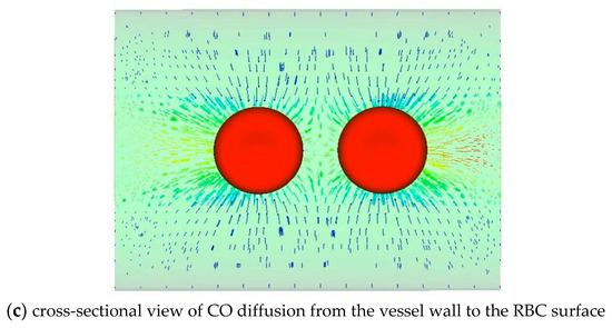 RBCs are deformed into a variety of asymmetric configurations under dynamic flow conditions, such as parachute-like shapes during capillary flow. Figure 4a–e depicts the dynamic deformation of an RBC from a bi-concave circular shape into a parachute shape. The distribution of CO flux over an RBC surface is depicted in Figure 4f. The magnitude of the flux is depicted by the vector’s length and color. It is evident that the flow distribution is not uniform. The flux is more concentrated at the deformed cell’s trailing tails than at its leading surface. At the folded trailing surface, the flux is quite low. Such an uneven distribution of gas flux is significantly increased when RBCs are grouped.
