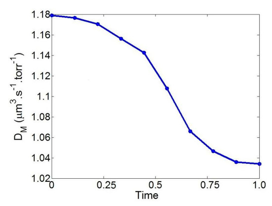 Figure 5. The time history of DM during the deformation of a single RBC. The time is normalized with a total time of 0.8 s.