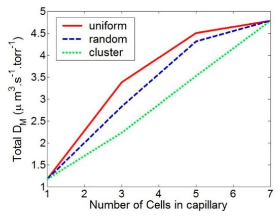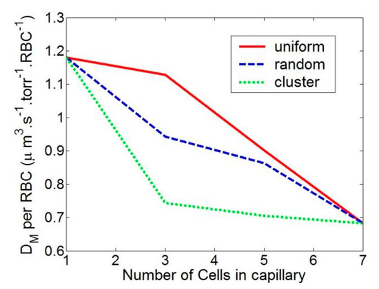 We looked at the uniform, random, and cluster distributions of RBCs. Figure 6 shows the RBC position and CO flow pattern for these three RBC distributions. In Figure 7, the total diffusion capacity DM for various RBC distributions is displayed. The RBCs with a homogeneous distribution have the highest overall diffusion capability. As the RBC distribution becomes random, it declines until it is at its lowest for clustered RBCs. The total diffusion capacity rises as the number of RBCs in the capillary does. It should be noted that when the capillary is entirely occupied (in our case, the capillary is totally occupied by 7 RBCs), the overall diffusion capabilities of the three distributions equal each other out. However, as illustrated in Figure 8, the diffusion capacity per RBC diminishes as the capillary’s RBC density (blood hematocrit) rises. This is due to the fact that tightly packed RBCs reduce the CO concentration in the area, which lowers the rate of absorption. It is extremely remarkable that a simple change in RBC distribution inside capillaries from uniform to nonuniform at a constant hematocrit can lower diffusive CO uptake by more than 50%.