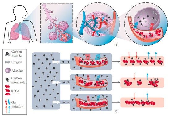 Figure 9. Pulmonary gas diffusion process and CO diffusion capacity of red blood cells under different aggregation states. (a) shows the natural diffusion process of CO2 and O2 carried by red blood cells in the lungs of human body. (b) shows our experimental results, that is, the effect of RBCs on the amount of gas diffusion in different aggregation and deformation states, it can be clearly concluded that the diffusion capacity of CO decreases when RBCs deform, and it can also be shown that RBCs in the aggregated state have significantly lower diffusion capacity.