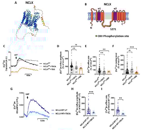 Inhibition of CKII by TBB and TBCA inhibits the [Ca2+]m transient. (A,B) Schematic model of NCLX membrane organization. (A) Was provided by AlphaFold Protein Structure Database. (B) The NCLX regulatory loop is located between the catalytic α1 and α2 domains. CKII phosphorylation site S271 is marked. (C) Representative SH-SY5Y cells co-expressing the [Ca2+]m fluorescent sensor Cepia2mt, shNCLX and NCLXWT (black), treated with TBCA (10 μM) for 2 h (grey), or TBB (10 μM) for 4 h (orange). The [Ca2+]m transient was triggered by application of extracellular ATP (100 μM) in a Ca2+-free Ringer’s solution. A.U.—arbitrary units. (D) Quantification of [Ca2+]m influx amplitudes in (C) (Welch and Brown-Forsythe ANOVA, F(2,96.56)= 6.538; Dunnett’s T3 multiple comparisons test; NCLXWT vs. NCLXWT+TBCA: **p = 0.0082; NCLXWT vs. NCLXWT+TBB: ns; n > 3). (E) Quantification of [Ca2+]m efflux rates in (C) (Welch and Brown-Forsythe ANOVA, F(2,151.4)= 11.3; Dunnett’s T3 multiple comparisons test; NCLXWT vs. NCLXWT+TBCA: **p = 0.0014; NCLXWT vs. NCLXWT+TBB; n > 3). (F) Quantification of [Ca2+]m basal intensity in (C) (Welch and Brown-Forsythe ANOVA, F (2,163.4) = 5.252; Dunnett’s T3 multiple comparisons test; NCLXWT vs. NCLXWT+TBCA: ns; NCLXWT vs. NCLXWT+TBB: ***p = 0.0009; n > 3). (G) Representative fluorescent traces action-potential (AP) induced influx of GCaMP6f expressing NCLX-WT hippocampal neurons derived from C57BL6 mice, treated (light blue) and untreated (deep blue) with TBCA (25 μM) for 2 h, stimulated at 2 Hz for 1.3 s. (H) Quantification of [Ca2+]m influx amplitude in (G) (unpaired two-tailed t-test, t = 3.580, df = 46.90, ***p = 0.0008; n > 3). (I) Quantification of [Ca2+]m efflux rates in (G) (unpaired two-tailed t-test, t = 2.21, df = 49, p = 0.0318; n > 3). n > 3. ns—not significant. Error bars denote SEM.