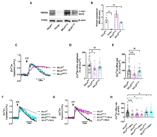 Regulation of [Ca2+]m efflux by CKII may be triggered by a direct or indirect effect of CKII on this exchanger. To determine if CKII is acting directly on NCLX, we used the phosphomimetic strategy that we have successfully used previously to study the regulation of NCLX by PKA [,]. We generated two point mutations on NCLX Ser271: replacing Ser with Asp, creating a site that mimicked a constitutively phosphorylated state, NCLXS271D; and replacing Ser with Ala, creating a mutant that mimicked a constitutive dephosphorylated state, NCLXS271A. NCLX mutants were co-expressed with the shNCLX (Sigma-Aldrich) construct, aimed to silence endogenous NCLX activity without affecting the expression of the mutants in SH-SY5Y cells []. To monitor the expression of the mutants versus NCLXWT, we performed Western blot analysis of the c-Myc-tagged constructs using a c-Myc antibody and found that the expression of NCLX mutants and NCLXWT were not significantly different (For Antibodies see Table 1). No expression of tagged NCLX was monitored, as expected, in the control vector (pcDNA3.1+) transfected cells (Figure 2A,B). Note that the NCLX band migrated as a dimer of ~100 kDa consistent with our pervious findings []. Their [Ca2+]m transient activity was then tested using the same experimental paradigm described in Figure 1. The [Ca2+]m removal rate by cells expressing mutant NCLXS271A was slower compared to that of the NCLXWT expressing cells (51 ± 10% of NCLXWT), demonstrating an inhibited NCLX efflux (Figure 2C,E). On the other hand, cells expressing the NCLXS271D mutant did not display an inhibitory effect of [Ca2+]m removal and manifested the same rate as that of WT NCLX (91% ± 11% of NCLXWT) (Figure 2C,E).