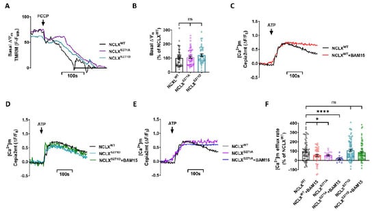 As we have previously shown, NCLX is allosterically regulated by slight changes in ΔΨm [], and phosphorylation of NCLX by PKA takes part in this regulation []. Here, we examined if this allosteric regulation of NCLX by ΔΨm is controlled by the CKII phosphorylation site. First, we tested if the expression of the NCLX mutations modulated ΔΨm measured in cells loaded and perfused with Tetramethylrhodamine Methyl Ester Perchlorate (TMRM). We calibrated ΔΨm resting values by using the mitochondrial oxidative phosphorylation uncoupler, protonophore 2-[2-[4-(trifluoromethoxy)phenyl] hydrazinylidene]-propanedinitrile (FCCP) []. No significant difference in basal ΔΨm was observed between NCLXWT and NCLXS271A\NCLXS271D expressing cells (Figure 3A,B). We then pretreated the SH-SY5Y cells, co-expressing a Cepia2mt and NCLXWT or NCLX mutant NCLXS271A\ NCLXS271D, with N5,N6-bis(2-Fluorophenyl)[1,2,5]oxadiazolo[3,4-b]pyrazine-5,6-diamine (BAM15) for 15 min. BAM15 is a mild mitochondrial uncoupler that enables precise and small changes in ΔΨm compared to FCCP []. Following BAM15 pretreatment, the [Ca2+]m transient was monitored as described in Figure 1. Consistent with our previous study, we found that the NCLX-dependent Ca2+ efflux rate was attenuated in the partially depolarized NCLXWT expressing cells (52 ± 12% of NCLXWT) (Figure 3C,F). We then asked if phosphomimetic NCLX mutants, NCLXS271D and NCLXS271A, modulate NCLX sensitivity to changes in ΔΨm. No inhibition was observed following partial depolarization in cells expressing the NCLXS271D constitutive active mutant, as untreated NCLXS271D expressing cells showed similar efflux rates to those of the treated cells (Figure 3D,F). In contrast, the [Ca2+]m efflux in NCLXS271A expressing cells was attenuated to a similar level in cells both treated with BAM15 (18 ± 11% of NCLXWT) and untreated cells (56 ± 8% of NCLXWT) (Figure 3E,F). Our results, therefore, indicate that the CKII site participates in tuning NCLX activity, which is linked to its allosteric regulation by ΔΨm.