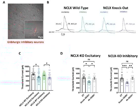 Mitochondrial activity is crucial for regulating neuronal excitability [,,,,,], and was identified as a central regulator of firing rate set points in hippocampal circuits []. Therefore, we examined the intrinsic properties of cultured excitatory and inhibitory hippocampal neurons derived from NCLX-WT and NCLX-KO mice. Whole-cell patch-clamp recordings were performed on cultured hippocampal neurons 13–15 days in vitro (DIV) to study the threshold current of the 2 ms injected depolarizing current necessary to evoke a single spike (Figure 4A). To identify GABAergic inhibitory neurons, we infected hippocampal cultures with a recombinant virus derived from an AAV-viral vector driving the expression of the fluorescent protein mCherry under the control of the specific GABAergic hDlx promoters [,] (Figure 4A). Excitatory hippocampal neurons were negative to mCherry fluorescence. Our results show that the threshold currents were similar in excitatory and inhibitory neurons, but were significantly lower in neurons derived from NCLX-KO mice compared to those from NCLX-WT mice (Figure 4B,C). This result suggests that hippocampal neurons derived from NCLX-KO mice are more excitable than those from NCLX-WT mice.