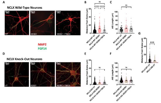 We previously showed that chronic neuronal hyperactivity, induced by M-channel inhibition, triggered intrinsic homeostatic plasticity in cultured hippocampal excitatory neurons on a fast timescale (1–4 h), including changes in the threshold current and a distal relocation of FGF14 along the axon initial segment (AIS) [,]. In contrast, homeostatic adaptations of intrinsic excitability failed in hippocampal GABAergic inhibitory neurons, which remained hyperexcitable following chronic M-channel blockage []. Here, we examined the impact of chronic M-channel inhibition on cultured hippocampal neurons derived from NCLX-KO mice. We found that acute M-channel block by 10 µM XE991 increased the excitability of both excitatory and inhibitory hippocampal neurons of NCLX-KO mice by significantly lowering the value of the threshold current (from 626 ± 37 pA to 459 ± 37 pA in excitatory neurons, and from 602 ± 35 pA to 416 ± 30 pA in inhibitory neurons) (Figure 4D). However, 4 h of chronic treatment with 10 µM XE991 triggered homeostatic adaptation of both excitatory and inhibitory neurons, with a return of the threshold current to the initial values measured in untreated hippocampal neurons (Figure 4D). Since we previously found that the AIS plasticity was dependent on CKII activity [], we next examined the AIS location of FGF14 following 4 h of chronic XE991 treatment of excitatory and inhibitory hippocampal neurons, as well as the effect of blocking of CKII activity by tetrabromocinnamic acid (TBCA). FGF14 is a protein physically bridging Nav1.6 and Kv7.2 channels along the AIS, and therefore represents a valuable reporter of the location of Nav1.6 and Kv7.2 channels at the AIS []. We focused on pyramidal-like excitatory neurons, which represent the majority (≈80%) of cultured hippocampal neurons from NCLX-WT and NCLX-KO mice (Figure 5). In line with our previous work [], 4 h of treatment with 10 µM XE991 of NCLX-WT hippocampal neurons produced a significant distal relocation (distance from the soma) of FGF14 along the AIS by about 4 µm, which was completely precluded by 25 µM TBCA treatment (Figure 5A–C). No change in the length of the FGF14 (AIS) segment was observed with either treatment (Figure 5C). In NCLX-KO hippocampal neurons, 4 h of chronic XE991 treatment did not produce distal relocation of FGF14, and we did not observe any effect of TBCA (Figure 5D–E and Figure 6). In these neurons, no change in AIS length was observed (Figure 5F). Interestingly, while the length of the FGF14 segment was very similar in hippocampal neurons from NCLX-WT and NCLX-KO mice, its distance from the soma was significantly shorter in NCLX-KO neurons than that in NCLX-WT mice (7.09 ± 0.41 µm and 4.87 ± 0.38 µm for untreated NCLX-WT and NCLX-KO neurons, respectively) (Figure 5G).