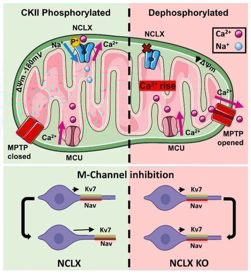 From apoptosis suppression of cancer cells [,,] to abnormal protein phosphorylation in Alzheimer’s disease [,], the ubiquitous CKII takes part in many crucial physiological and pathophysiological processes in the cell. Lately, several studies have suggested that CKII might also have a metabolic role, which is still poorly understood [,,]. In our previous study on PKA regulation of the mitochondrial Na+/Ca2+ exchanger, NCLX, we conducted a mass spectral analysis [] that identified a putative CKII phosphorylation site residing on the regulatory loop of NCLX. Mitochondrial Ca2+ ([Ca2+]m) signaling is largely regulated by NCLX [,]. Following its flow into the mitochondria through the uniporter, Ca2+ is then extruded by the much slower NCLX, which is, therefore, a rate-limiting step in [Ca2+]m transport []. [Ca2+]m signaling plays several key roles in mitochondrial and cellular function; among them is the regulation of the Krebs cycle [,,] and the electron transport chain [], as well as tuning of local Ca2+ signaling hot spots at the vicinity of the cell membrane or the ER [,,,]. Moreover, imbalance in [Ca2+]m, the so-called [Ca2+]m overload, is a hallmark event of many major health syndromes such as neurodegenerative diseases, brain stroke, and cardiac failure []. CKII is a ubiquitous kinase and is a heterodimer composed of α1, α2, β1 and β2 subunits. CKII activity promotes cell proliferation and survival, and is therefore often linked to cancer propagation. This kinase dynamically shuttles between the cytosol and the nucleus. The strong antiapoptotic role of CKII is also attributed to the regulation of mitochondrial cell death-controlling proteins, such as BID and BCL2. However, it is unknown if CKII can enter the mitochondria or phosphorylate intra-mitochondrial proteins []. While most studies on CKII are focused on cancer, new and surprising studies have suggested that CKII also takes part in axonal plasticity []. The axon initial segment (AIS), the spike generation region of the neuron, can exhibit fast plasticity over time [], a vital process for dynamic neuronal network tuning. AIS plasticity can be triggered by blocking axonal M-type K+ channels, leading to distal relocation of Na+ and M-channels on the AIS away from the soma within a few hours []. Although AIS plasticity is CKII-dependent, the link between CKII and this homeostatic neuronal process is poorly understood.