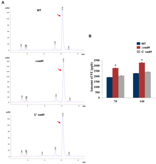 3.4. Deleting VadH Leads to an Increase in ST Production
