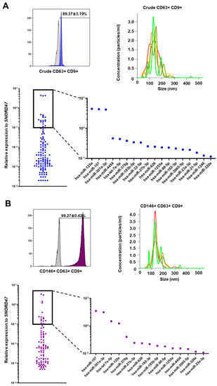 Upon ultracentrifugation and CD63+ immunoselection, CD9, a typical surface marker used to validate exosome presence by flow cytometry, was analyzed, and demonstrated high purity (>90%) in Crude (Figure 2A) and CD146+ eMSC EXOs (Figure 2B). Additionally, EXOs were characterized by size using a nanoparticle tracking analysis (NTA). Both crude (Figure 2A) and CD146+ (Figure 2B) eMSC EXOs showed sizes < 200 nm.