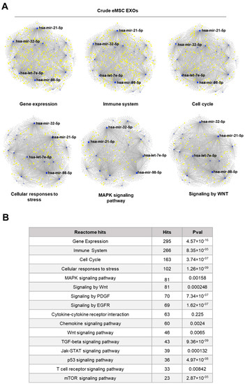 Reactome and KEGG analysis of miRNAs highly present in Crude eMSC EXOs. (A,B) Four miRNAs (hsa-mir-21-5p, hsa-mir-32-5p, hsa-mir-98-5p, and hsa-let-7e-5p) for Crude eMSC EXOs with higher node degrees act as hubs in the gene network. Crude eMSC EXOs showed their involvement in the regulation of six gene groups related to gene expression, immune system, cell cycle, cellular responses to stress, MAPK signaling, and WNT signaling pathways.