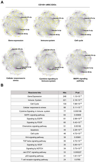 Reactome and KEGG analysis of miRNAs highly present in CD146+ eMSC EXOs. (A,B) Three miRNAs (hsa-mir-27b-3p, hsa-mir-98-5p, and hsa-let-7e-5p) for CD146+ eMSC EXOs with higher node degrees act as hubs in the gene network. CD146+ eMSC EXOs showed their involvement in the regulation of six gene groups related to gene expression, immune system, cell cycle, cellular responses to stress, cytokine signaling in immune system, and MAPK signaling pathways.