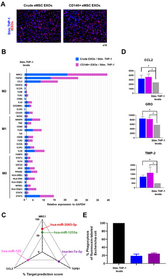 In co-cultures, PMA/IO-stimulated THP-1 internalized eMSC EXOs (Figure 5A). At the molecular level, PMA/IO-stimulated THP-1 molecular profiling indicated a strong gene expression shift towards an M2 macrophage polarization by both Crude and CD146+ eMSC EXOs (Figure 5B). Most importantly, the expression levels of MRC1 (CD206), a characteristic M2-polarization macrophage marker [35], was strongly induced when macrophages were exposed to CD146+ eMSC EXOs. TGFB1 and CCL2 expression levels were also significantly induced by CD146+ eMSC EXOs. These three highly expressed genes in M2-polarized macrophages upon exposure to eMSC EXOs were used for in silico correlation with identified specific miRNA cargo during eMSC EXOs miRNA profiling. Interestingly, a MirTarget prediction scoring system revealed MRC1 as a target for hsa-miR-1255a and hsa-miR-3065-5p (60% and 71% probability, respectively), TGFB1 as a target for hsa-let-7e-5p (59%), and CCL2 as a target for hsa-miR-125a (51%) (Figure 5C). Notably, all four miRNAs were highly present in both Crude and CD146+ eMSC EXOs. eMSC EXOs significantly increased secretion of M2-polarization-related molecules (CCL2, GRO, and TIMP-2) in PMA/IO-stimulated THP-1 compared to stimulated THP-1 alone (Figure 5D).