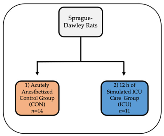 Young adult (~4–6 months old) female Sprague Dawley rats were randomly assigned to one of two experimental groups: (1) acutely anesthetized control group (CON, n = 14), and (2) ICU simulation group (ICU, n = 11) (Figure 1). Prior to the experiments, the animals were housed in a 12:12 h light cycle with food and water provided ad libitum. Animals were allowed to acclimate in the animal housing facility for 7 days prior to experimentation after being purchased from an accredited vendor. The animals were cared for in accordance with the Guide for the Care and Use of Laboratory Animals. These experiments were approved by the Institutional Animal Care and Use Committee of the University of Florida.