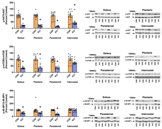 Muscle protein synthesis signaling. Ratio of p-AKT/t-AKT (Ser 473), p-mTOR/t-mTOR (Ser 2448) and p-4E-BP1/t-4E-BP1 (Thr 37/46) in the soleus, plantaris, parasternal, and intercostal muscles of control, non-anesthetized, non-ventilated rats (CON), and rats that underwent 12 h of controlled mechanical ventilation (ICU). Representative Western blots are shown to the right of the graph. Data are presented as mean ± SEM. * significantly different vs. CON (p < 0.05).