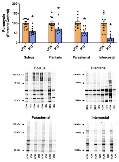 No differences in body weight existed between the two groups at the start of the experiment (CON = 291 g ± 7.2; ICU = 286 g ± 3.2). CON animals remained awake and ambulatory in their cages throughout the 12 h experimental time period. At the endpoint, CON animals were acutely anesthetized using intraperitoneal (IP) injections with sodium pentobarbital (60 mg/kg body weight). Upon reaching a surgical plane of anesthesia, the animals received an IP injection of puromycin (0.04 µmol/g of body weight) (InvivoGen, San Diego, CA, USA) for the measurement of protein synthesis [13]. The incorporation of puromycin into growing polypeptide chains (i.e., protein synthesis rate) was later determined by immunoblotting for puromycin in the total protein extracts via Western blotting. Thirty minutes following the injection of puromycin, the animals were euthanized, and the soleus, plantaris, parasternal intercostal, and intercostal (intact external and internal intercostal) muscles were promptly removed. Tissues were rapidly frozen in liquid nitrogen and stored at −80 °C for subsequent biochemical analysis. A section from each muscle was rapidly frozen in an OCT medium at an unstressed length in isopentane and was chilled to the temperature of liquid nitrogen. These samples were then stored at −80 °C for the subsequent measurement of the muscle fiber cross-sectional area (CSA). Animals in the ICU group were anesthetized using IP injections with sodium pentobarbital (60 mg/kg body weight) and underwent 12 h of controlled MV. Throughout the 12 h MV period, the animals remained immobile with their limbs passively stretched every two hours. Animals received puromycin (0.04 µmol/g of body weight) identical to the CON group thirty minutes prior to the end of the 12 h experimental period and were euthanized thirty minutes later. Tissues were then removed and stored identically in the CON group.
