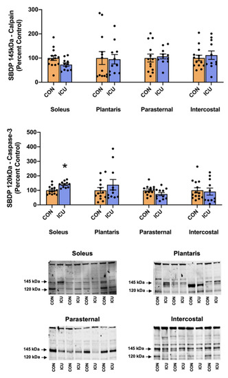 Skeletal muscle protein degradation was assessed by the measurement of several key markers of proteolytic activity. To evaluate the impact of simulated ICU care on the activation of calpains and caspase-3, we measured two well-established biomarkers of calpain and caspase-3 activity. Specifically, the cytoskeletal protein αII-spectrin is cleaved into two different signature fragments by active calpain and caspase-3 proteases; the 145-kDa spectrin breakdown product (SBDP) is indicative of calpain activity, and the 120-kDa SBDP is a sensitive biomarker of caspase-3 activation [14,15]. Our findings reveal that 12 h of simulated ICU care does not activate calpain in the limb or respiratory muscles (Figure 4). Similarly, 12 h of simulated ICU care does not activate caspase-3 activity in the plantaris, parasternal intercostal, and intercostal muscles. However, 12 h of ICU care does activate caspase-3 in the soleus muscle (Figure 4).