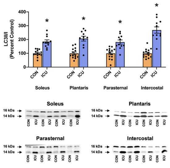 Ratio of LC3II/I as a marker of autophagy signaling. Ratio of LC3II/I in the soleus, plantaris, parasternal, and intercostal muscles of control, non-anesthetized, non-ventilated rats (CON), and rats that underwent 12 h of controlled mechanical ventilation (ICU). Representative Western blots are shown below the graph. Data are presented as mean ± SEM. * significantly different versus CON (p < 0.05).