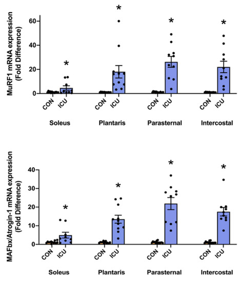 Finally, mRNA levels of the muscle-specific E3 ligases MuRF1 and MAFbx/Atrogin-1 were evaluated as biomarkers of ubiquitin-proteasome system signaling. Compared to the control, mRNA levels of both MuRF1 and MAFbx/Atrogin-1 were significantly increased in the hindlimb and respiratory muscles of animals exposed to 12 h of a simulated ICU environment (Figure 6).