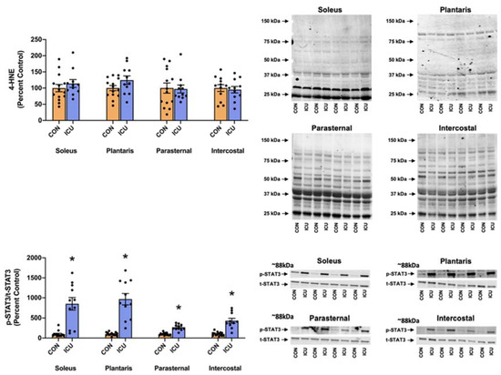 Importantly, 12 h of simulated ICU care resulted in significant increases in phosphorylated STAT3 in both limb muscles (soleus and plantaris) and respiratory muscles (parasternal intercostal and intercostal) (Figure 7). Specifically, our findings reveal that the ratio of phosphorylated to total STAT3 protein was significantly elevated in the soleus, plantaris, parasternal intercostal, and intercostal muscles (Figure 7). By contrast, no differences existed between the 4-HNE levels in the limb muscles and respiratory muscles between the experimental groups (Figure 7).