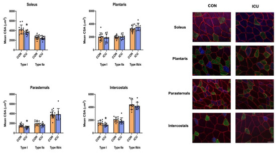 As the decisive measure of ICU-disturbed proteostasis within the limb and respiratory muscles, we measured the CSA of all muscle fiber types. Following 12 h of simulated ICU care, the CSA of type I muscle fibers was significantly reduced in both the respiratory muscles (parasternal intercostal and intercostal muscles) and the soleus muscle. Although a trend existed, ICU care did not result in the significant atrophy of the type I fibers in the plantaris muscle. Note that 12 h of simulated ICU care did not promote the significant atrophy of type II fibers in any muscle investigated (Figure 8).