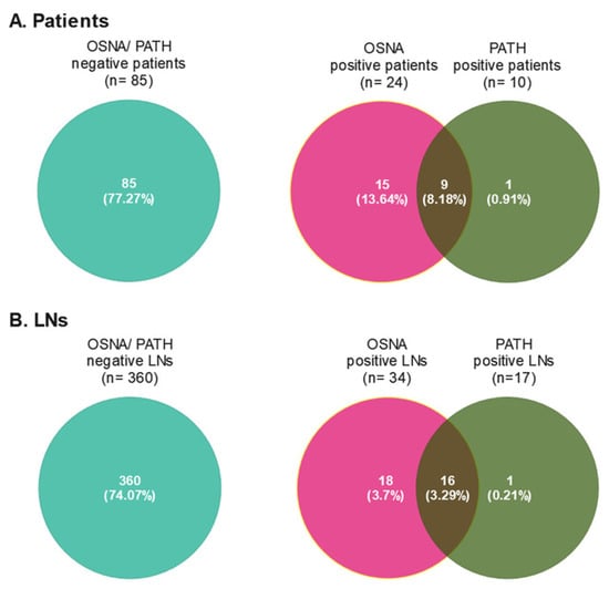 Venn diagrams comparing the different techniques (OSNA and PATH (H&E and IHC)) for detection of metastases in patients studied (A) and in their individual lymph nodes (B). The percentage is based on the total number of patients and LNs included in the study.