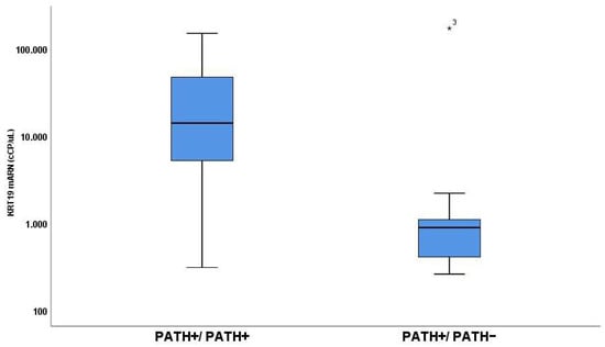 Box plot showing the distributions of the two OSNA+/PATH+/− expression profiles. The y-axis indicates the TTL of mRNA CK19 cCP/uL in patients on a logarithmic scale. Asterisk (*) denotes a data of patient 16 with a very high load of copies of mRNA CK19.