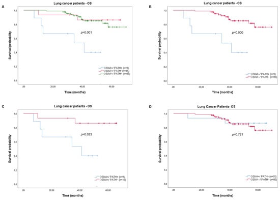 Kaplan-Meier curves comparing OS distribution according to three patient profiles OSNA+/PATH+, OSNA+/PATH− and OSNA−/PATH− (A). OS of lung cancer patient OSNA+/PATH+ vs. OSNA−/PATH− (B); OSNA+/PATH+ vs. OSNA+/PATH− (C); and OSNA+/PATH− vs. OSNA−/PATH− (D).
