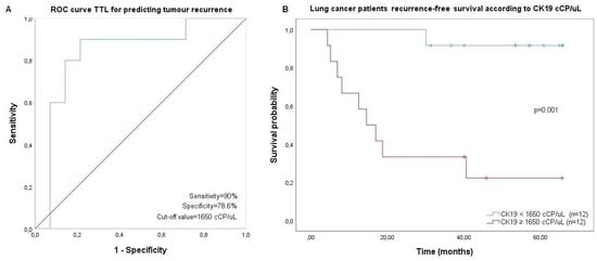 ROC curve for recurrence. Area = 0.836 95% IC (0.659–1.000), p-value = 0.006 (A). OS curve for patients without recurrence (<1650 cCP/uL) vs. patients with recurrence, p-value = 0.001 (B).