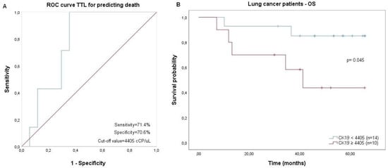 ROC curve for predicting death. AUC = 0.773 95% IC (0.588–0.959), p-value = 0.039 (A). OS curve for patients with high survival probability (<4405 cCP/uL) vs. patients with low survival probability (≥4405 cCP/uL) p-value = 0.045 (B).