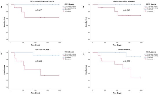 Kaplan-Meier curves comparing OS and DFS distribution in patients with high or low levels of CK19, and the appearance of loco-regional and distant metastasis. (A). DFS curve for patients harboring loco-regional metastasis with high survival probability (<1650 cCP/uL) vs. patients with low survival probability (≥1650 cCP/uL) p-value = 0.006. (B) DFS curve for patients harboring distant metastasis with high survival probability (<1650 cCP/uL) vs. patients with low survival probability (≥1650 cCP/uL) p-value = 0.045. (C) OS curve for patients harboring loco-regional metastasis with high survival probability (<4405 cCP/uL) vs. patients with low survival probability (≥4405 cCP/uL) p-value = 0.045. (D) OS curve for patients harboring distant metastasis with high survival probability (<4405 cCP/uL) vs. patients with low survival probability (≥4405 cCP/uL) p-value = 0.006.