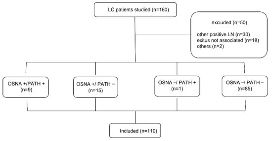 Patients with resectable lung cancer whose LNs were studied by OSNA, H&E and CK19 IHC between July 2015 and December 2018. Of the 160 patients belonging to the study, 110 subjects with clinical stages from IA1 to IIIB according to the latest AJCC Cancer Staging Manual of the TNM classification for lung cancer [] were chosen for follow-up. Patients with lung cancer and positive LNs not studied by OSNA, as well as those who died from events not associated with lung cancer, were excluded. The flowchart is shown in Scheme 1. Follow-up data were collected from medical records and the median follow-up was 42.8 (IQR 33.72–55.36) months. The detailed characteristics of the group are provided in Table 1.