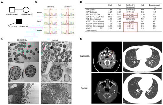 A 12-year-old PCD patient with a DNAH5 mutation was identified by clinical symptoms, lung functional tests and exome sequencing. The exome sequencing results showed that the proband had a compound DNAH5 gene mutation with c.1837G>C and c.13486C>T mutations inherited from his mother and father, respectively (Figure 1A,B). The spirometry data from this patient suggested a moderate obstructive ventilation dysfunction and small airway airflow obstruction (Figure 1D). We next questioned whether DNAH5 mutations result in ciliary ultrastructural abnormalities. To answer this question, the patient’s bronchoscopic biopsy was collected and examined by TEM. The results demonstrated the presence of a “9 + 2” axoneme structure and partial defect of the outer dynein arm, consistent with previous studies (Figure 1C). Nasosinusitis and bronchiectasis, the common clinical features in PCD patients, were confirmed by computed tomography (CT) (Figure 1E). These results indicate that the compound DNAH5 mutations could affect the structure of the outer dynein arm and further lead to the disease manifestation of PCD.
