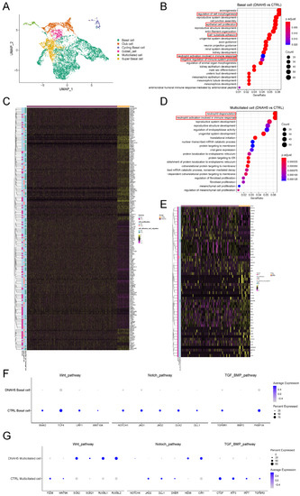 Single-cell transcriptional profiles from child PCD organoids. (A) UMAP plots of expression from scRNA-Seq of child airway organoids (DNAH5-mutated and control). (B) GO enrichment analysis of biological processes in basal cells (DNAH5 vs. CTRL). (C) Heatmap of the differentially expressed genes in immune response, regulation of cell morphogenesis, cell-substrate adhesion and epithelial cell proliferation between DNAH5 mutation and normal organoids. (D) GO enrichment analysis of biological processes in multiciliated cells (DNAH5 vs. CTRL). (E) Heatmap of the differentially expressed genes in the immune response between DNAH5-mutated and normal organoids. (F,G) Dot plot of Wnt, TGF-β/BMP and Notch pathway-regulated genes in basal cells and multiciliated cells in DNAH5-mutated and normal airway organoids. The colour gradient (grey to blue) and dot size indicate the mean marker expression and the percentage of cells expressing the marker for each cluster.