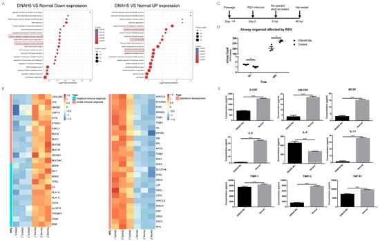Decreased immune response in DNAH5-mutated organoids. (A) GO enrichment analysis of biological processes in DNAH5-mutated and normal airway organoids. The immune responses were downregulated in DNAH5-mutated airway organoids (left), whereas epithelial cell differentiation was downregulated (right). (B) The heatmap illustrates the expression level changes of the statistically significant proteins related to the adaptive immune response, innate immune response and epithelial development between DNAH5-mutated and normal airway organoids. (C) Stepwise protocol for airway organoids infected by RSV. (D) The copies of RSV-N detected by ddPCR confirming the different infections between DNAH5-mutated and normal airway organoids. * p < 0.05; n = 3 replicates. (E) The expression of immune factors in DNAH5-mutated and normal airway organoids infected by RSV at 48 hpi. **** p < 0.0001; n = 3 replicates.