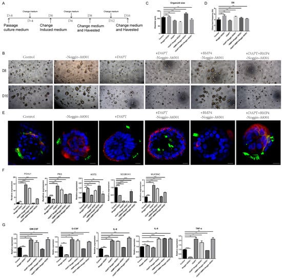 In the airway epithelium, previous studies have demonstrated that cilia differentiation is closely associated with TGF-β/BMP and Notch signal changes, and our single-cell sequencing further showed significant changes in the TGF-β/BMP and Notch pathways in the DNAH5-mutated organoids [22,28,29]. Furthermore, a decrease in the immune response was also observed in the child airway organoids with the DNAH5 mutation at the mRNA and protein levels. However, it is unclear whether the CBF and the immune response are influenced by the TGF-β/BMP and Notch signalling in vitro. To clarify this question and optimize the differentiation medium, we attempted to inhibit the Notch signal and activate the BMP signal separately and in combination. The normal airway organoids were digested into single cells and passaged. After the single cells grew into a hollow sphere for approximately 8 days, the cilia-induced medium was added at D0, and the airway organoids were analysed and harvested at D8 and D16 (Figure 5A). Treatment with DAPT, a gamma-secretase inhibitor, significantly induced FOXJ1 mRNA expression and increased the numbers of ciliated cells in the airway organoids, whereas Scgb1A1 mRNA expression was decreased compared with the control group or other treatments (Figure 5E,F). Meanwhile, the FOXJ1 mRNA expression and the numbers of ciliated cells were not increased by withdrawing the TGF-β/BMP signalling inhibitors Noggin and A83-01 or with the BMP4 factor in combination. However, the induced strength following the addition of the DAPT and BMP4 and removal of the Noggin and A83-01, was slightly increased compared to that of the control and weaker than that of the treatment without the BMP4 (Figure 5B,E,F). The highest proportions of ciliated cells were also induced by the DAPT plus the removal of the Noggin and A83-01, as demonstrated by flow cytometry (Figure S2B,C, Vedios S3–S8). To test whether the ciliary function and the organoid state were affected by the in vitro induced medium, we recorded and analysed the CBF and organoid size at D8 and D16 (Figure 5C,D and Figure S2D–F). The observation that the organoid size of the majority of the treatments at D16 was larger than that at D8 suggested that the proliferative ability of the organoids could be maintained under the inducing treatment (Figure S2E). However, the combination of the DAPT and BMP4 and the removal of the Noggin and A83-01 significantly inhibited the organoid size during the induced period. On the other hand, the CBF of all the treatments was recorded at room temperature, and the average was 4 Hz. The removal of the Noggin and A83-01 slightly increased the CBF, while the DAPT did not affect the CBF. Taken together, our results further showed that the differentiation of airway stem cells into ciliated cells was regulated by Notch and TGF-β/BMP signalling. The inhibition of Notch signalling and removal of the inhibitors of TGF-β/BMP signalling could harvest the highest proportions of ciliated cells in a short time, which is highly efficient and suitable for cilia-related research. In view of the decreased immune response in the DNAH5-deficient organoids, we questioned whether the expression of cytokines could be affected by a cilia-induced treatment. Our results show that the mRNA levels of the main cytokines, G-CSF, GM-CSF, IL-6, IL-8 and TNF-α, were significantly changed in the airway organoids under the different treatments (Figure 5G). Together, we have established an optimized cilium-induced and immune-regulated condition upon the modulation of the TGF-β/BMP and Notch pathways.