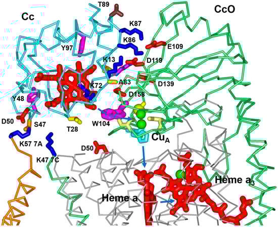 heme c → Cc-C14 → Cc-K13 → CcO-Y105 → CcO-M207 → CuA.