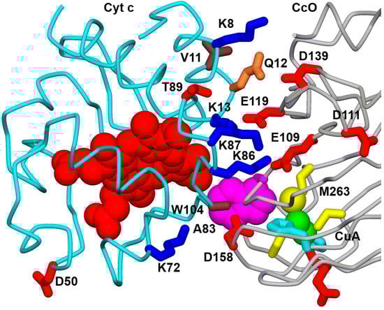 Structure of the computational horse Cc:CcO complex [] showing the amino acid residues that are mutated from horse to human Cc. Cc lysines and CcO aspartates and glutamates are also shown.