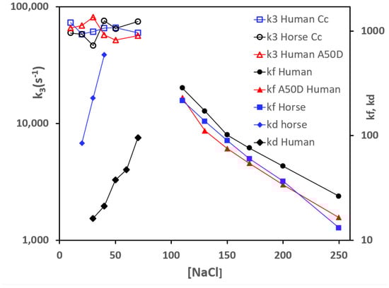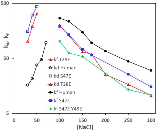 The kinetics of the reaction between human Cc phosphomimetic mutants and CcO was studied using laser-excited lumiflavin to rapidly transfer an electron to unbound oxidized Cco to form reduced Ccr [,]. Excited lumiflavin cannot transfer an electron to Cco in the Cco:CcO complex because the heme crevice of Cc is not accessible. Excited lumiflavin also cannot reduce CcO CuA or heme a [,]. The lumiflavin flash photolysis technique is limited to the measurement of rate constants kobs of less than 2000 s−1. Flash photolysis of a sample containing 10 μM human Cc, 4.5 μM CcO, 100 μM lumiflavin, 0.5 mM EDTA, 30 mM NaCl in 5 mM sodium phosphate buffer resulted in reduction of unbound Cc, followed by electron transfer from Ccr to CcO with a rate constant of kobs = 13 s−1. Since KD < 0.1 μM at low ionic strength, kd can be determined from Equation (7) to be kd = 16 s−1 at 30 mM NaCl (Figure 6). As the ionic strength was increased to 100 mM NaCl, kobs increased to 250 s−1, and then decreased with further increases in NaCl. At ionic strengths above 150 mM, KD > 30 μM, and kf can be determined from Equation (6) (Figure 6). The T28E and S47E human Cc mutants significantly increased the value of kd at low ionic strength, and decreased the value of kf at high ionic strength (Figure 6, Table 2). The S47E Y48E double mutant decreased the value of kf more than that of the S47E single mutant. These results indicate that phosphorylation of human Cc T28, S47, and Y48 decreases the strength of the interaction between Cc to CcO.