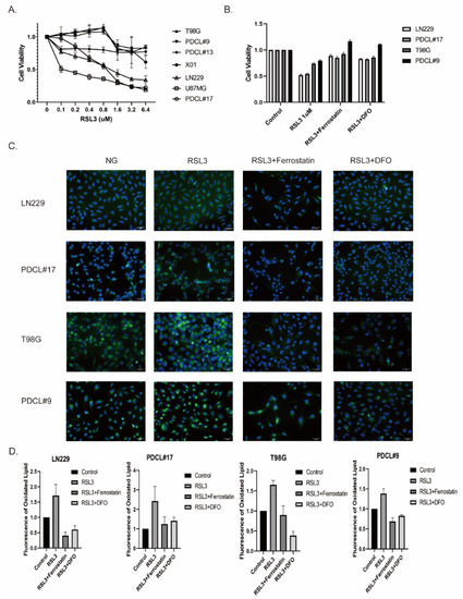 - Yang, F.C.; Wang, C.; Zhu, J.; Gai, Q.J.; Mao, M.; He, J.; Qin, Y.; Yao, X.X.; Wang, Y.X.; Lu, H.M.; et al. Inhibitory effects of temozolomide on glioma cells is sensitized by RSL3-induced ferroptosis but negatively correlated with expression of ferritin heavy chain 1 and ferritin light chain. Lab Investig. 2022, 102, 741–752. [Google Scholar] [CrossRef] [PubMed]