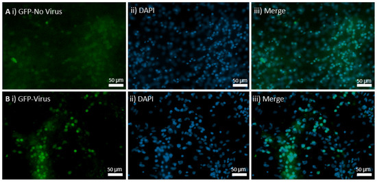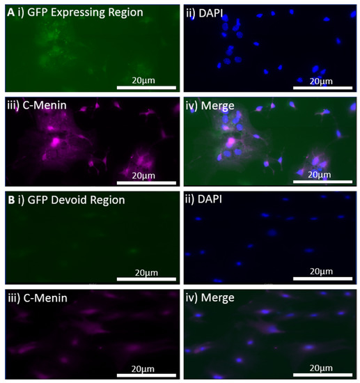 The transduction of hippocampal neuronal cultures from the MEN1 floxed mice with the virus, pNN.AAV.hSyn.HI.eGFP-Cre.WPRE.SV40. (A) Controls with no virus; (i) GFP signal in the absence of virus; (ii) DAPI for nuclear staining; (iii) merge with GFP and DAPI; (B) CKO with virus transduction by Cre AAV9; (i) GFP signal indicating virus transduction in the preparation with the Cre AAV9; (ii) DAPI for nuclear staining; (iii) merge with GFP and DAPI showing overlap in the neurons expressing GFP and DAPI.