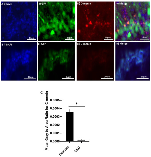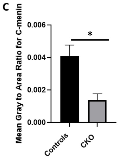 Once the virus transduction was confirmed in the controls and the CKOS, the next step was to determine if menin was deleted in the CKO model. Using an immunostaining approach, we confirmed that menin was indeed deleted from the AAV9 Cre-expressing neurons. The mean gray-to-area ratio of the controls was 0.0003575 and the mean gray-to-area ratio of the CKO was 0.00001988 (Figure 7). The C-menin expression was significantly reduced in the CKO.