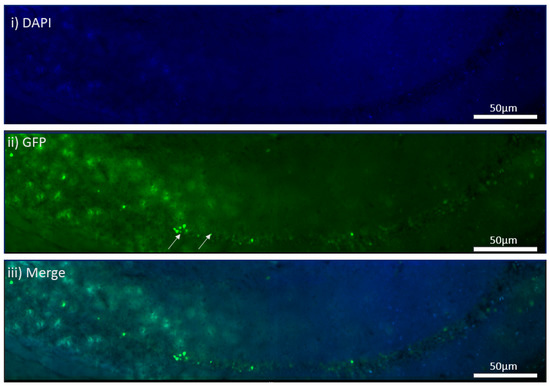 Ectopic expression in the hippocampus of the mice injected with AAV9 under the function of synapsin promoter and GFP as the marker for the virus transduction. (i) The expression of DAPI for nuclear staining; (ii) GFP as the marker of virus transduction in the neurons transduced by the control AAV9 under the action of synapsin promoter; (iii) merge in controls showing overlap between DAPI and GFP.
