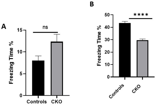 Contextual fear conditioning deficits in the CKO mice. (A) For the contextual fear conditioning test, mice were trained and analyzed for freeze response. The scores of the freezing time (%) for the control mice and the CKO on day one show little difference; (B) CKO animals had a lower freezing time % score on day two compared to the controls. Freezing response is the percentage of time spent freezing from the total time duration. Data represent the mean ± SEM. n = 16. Statistical significance (Mann–Whitney U test), **** p < 0.0001, ns p > 0.05.