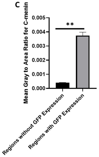 Having confirmed the expression of GFP with virus transduction, we next sought to determine if any alteration in the expression patterns of menin could be observed in the CKO and control preparations. This was followed by immunostaining both the controls and CKO to determine if the menin expression changed after MEN1 gene deletion. The mean gray-to-area ratio of the controls was 0.004112, and the mean gray-to-area ratio of the CKO was 0.001380 (Figure 3). The C-menin expression was significantly reduced in the CKO, and the neurons exhibiting C-menin showed reduced dendritic branching in the CKO.