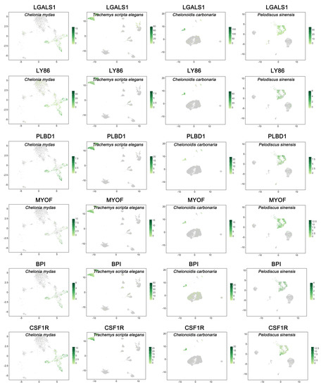 Monocytes, as circulating white blood cells, patrol the body and populate specific tissues in response to environmental stimuli. In human peripheral blood, monocytes can be divided into different subsets based on the expression of the surface markers CD14 and CD16 [37]. In contrast to the findings of previous studies, CD14 and CD16 were not expressed in the peripheral blood monocytes of the testudines, while six marker genes, LGALS1, LY86, PLBD1, MYOF, BPI, and CSF1R, were highly expressed and enriched in response to positive regulation of stimulus and stress, leukocyte chemotaxis, and migration (Supplementary Figure S2A). Previous studies have shown that LGALS1, LY86, PLBD1, BPI, and CSF1R were expressed in monocytes [38,39,40,41,42]. MYOF was observed to be expressed in monocytes for the first time; it was mainly involved in biological processes of response to temperature stimulus and syncytium formation (Supplementary Figure S2B). Based on these marker genes, we identified two distinct monocytes in the peripheral blood cells of C. mydas (CSF1R monocyte and RAB3B monocyte), T. scripta elegans (CSF1R monocyte and POF1B monocyte), C. carbonaria (CSF1R monocyte and GPRC5A monocyte), and P. sinensis (CSF1R monocyte and LARP6 monocyte).