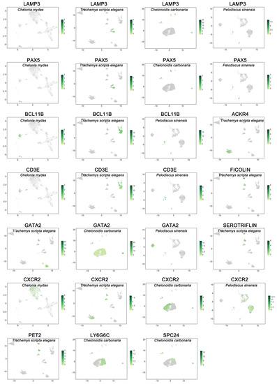 As described, the present study established a more comprehensive single-cell transcriptomic atlas of peripheral immune cells in testudines occupying different ecological environments. The present results showed that the composition of peripheral immune cells differed among testudines from different habitats. T. scripta elegans from freshwater and brackish environment had the most complex composition of peripheral immune cells, with 11 distinct immune cell clusters identified in total. C. mydas, which inhabits shallow tropical and subtropical waters as well as coastline beaches, had the simplest composition of peripheral immune cells, with only five distinct immune cell clusters. The numbers of immune cell clusters in the terrestrial C. carbonaria and P. sinensis from sedimentary freshwater areas were between those of T. scripta elegans and C. mydas. Eight distinct immune cell clusters were identified in C. carbonaria, while six distinct immune cell clusters were identified in P. sinensis. Interestingly, the peripheral immune cells were the most diverse in T. scripta elegans, which may also be one reason why T. scripta elegans is remarkably adaptable to the environment, as one of the 100 most threatening aliens in the world. These results illustrated that the more complex environment of testudines inhabited, the more diverse the peripheral immune cells were. Because different ecological niches could drive the adaptive evolution of immune-related gene families [5,6]. So different ecological niches may drive the adaptive evolution of peripheral immune cells in testudines.