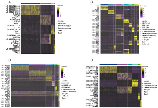 In this study, the peripheral immune cells of testudines were identified using scRNA-seq technique for the first time. Previous studies using traditional light microscopy methods have identified five types of peripheral immune cells in testudines (Testudo graeca, Emys orbicularis, Mauremys capsica, T. scripta scripta, C. mydas, Caretta caretta, C. carbonaria, and Lepidochelys olivacea), namely, basophils, eosinophils, lymphocytes, heterophils, and monocytes [7,8,9,10,31,32]. However, in Agrionemys horsfieldi, seven types of peripheral immune cells were identified by light microscopy methods: lymphocytes, monocytes, heterophils, eosinophils, azurophils, basophils, and toxic heterophils [33]. The rapid development of scRNA-seq technology provides a powerful tool and unprecedented opportunity to define cell taxonomy, track differentiation, and uncover transcriptional networks at single-cell resolution for any given isolatable heterogeneous cell population. At present, research on peripheral blood immune cells by scRNA-seq technology has mainly been applied in the medical field [16,34,35], as well as to research immune defenses in other species such as the molluscan Crassostrea hongkongensis [13] and mammalian mice [36].