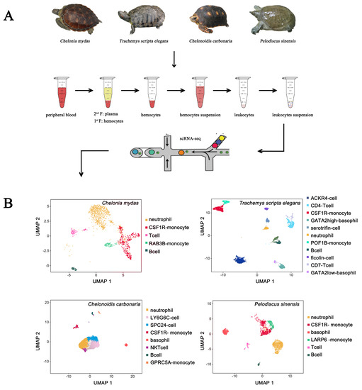 Peripheral immune cells mainly participate in immune responses in testudines. Although different methods, such as bioimaging and histochemical staining, have been used to study the classification of the blood cells of turtles [7,8,9]. All five peripheral immune cells were identified in most turtles, namely basophils, eosinophils, lymphocytes, heterophils, and monocytes using traditional techniques (histochemical staining techniques, microscopic, and submicroscopic) [8,9,10]. However, turtle granulocytes cannot be accurately identified using traditional methods. There is a lack of consensus on their classification, which markedly hinders our understanding of detailed immune functions. The advent of single-cell RNA sequencing (scRNA-seq) techniques has allowed researchers to study non-classified cells based solely on the mRNA expression pattern of each cell. In particular, scRNA-seq not only helps to identify cell types but also resolves cell states. This method has been used for both invertebrates and vertebrates, including shrimp [11,12], oysters [13], hydra [14], mice [15], and humans [16]. The identification of specific cell states provides a better understanding of cell function.