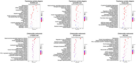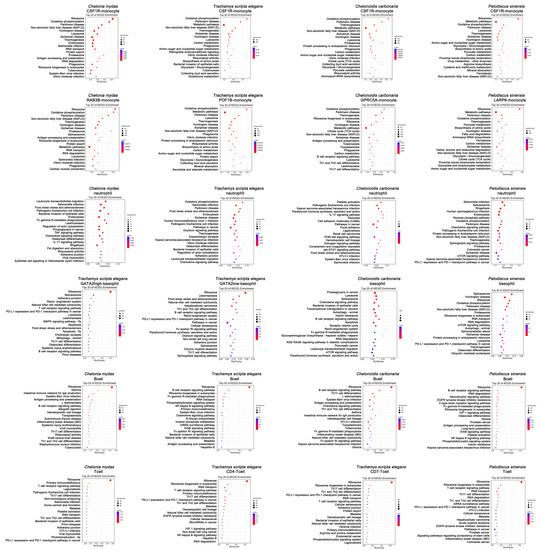 As for the newly discovered innate immune cell types, LOC117875385, LOC117886016, PLK3, LOC117873755, and LOC117869907 were specifically upregulated in the serotriflin-cell type of T. scripta elegans, and were enriched in pathways involved in viral and bacterial infections, parasitosis, cancer, endocytosis, and phagocytosis; LOC117867189, LOC117868675, LOC117873455, HRH4, and LOC117868150 were highly expressed in the ficolin cells of T. scripta elegans, and were enriched in pathways related to endocytosis, disease, pathogenic infection, leukocyte transendothelial migration, chemokine signaling, necroptosis, and oxidative phosphorylation; PITPNM2, OGT, PRPF4B, LOC116835191, and PNISR were highly expressed in the NKT cells of C. carbonaria and were enriched in pathways related to virus infection, cancer, B cell receptor signaling, natural killer cell-mediated cytotoxicity, and endocytosis (Figure 3 and Figure 6).